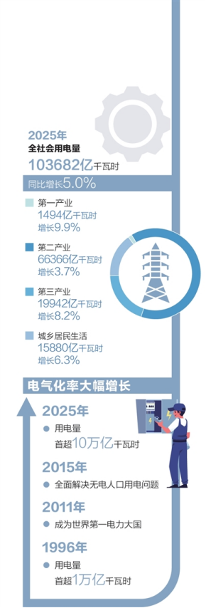 103682亿千瓦时!国家能源局最新发布的数据显示,2025年,我国全社会用电量首超10万亿千瓦时,为全球首次。
