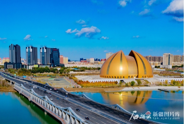 往昔灯火与今日虹霓在此交相辉映。大漠长风正与人民剧场门前弹奏热瓦普的雕塑深情相拥,它掠过人民会堂的琉璃飞檐,轻抚大剧院的金属花瓣。它们以凝固的乐谱,见证着这片土地永不停息的舞台——那里有历史的回响,有现实的交响,更有未来的和鸣。