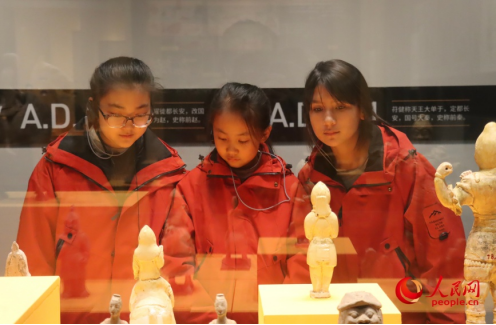 走进西安博物院,园区内历史古建筑与现代建筑交相辉映,进入馆区的中央大厅,首先映入眼帘的是地面上一幅古代西安都城变迁图。在讲解员的引导下,同学们有序参观展厅,从古代的青铜器、玉器、陶俑,到反映古代丝绸之路交往的各类文物,大家仔细聆听,不时驻足观察、拍照。