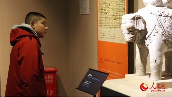 乌鲁木齐市第八十二小学学生伊尔凡·依明江在参观文物。人民网李龙摄