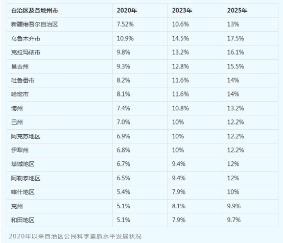 据第十五次中国公民科学素质抽样调查结果显示,2025年,新疆维吾尔自治区公民具备科学素质的比例达到13%,比2020年的7.52%提高了5.48个百分点,超额完成《自治区全民科学素质行动规划纲要实施方案(2021—2025年)》确定的2025年达到12%的目标,我区公民科学素质水平已进入新的发展阶段,公众的科学意识和理性思维明显提升,崇尚科学、追求创新的社会氛围日益浓厚,建设社会主义现代化新疆的科学文化素质根基进一步夯实。