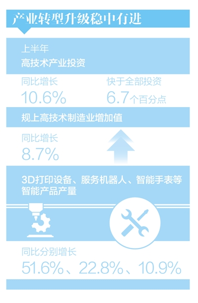 科技创新引领作用增强,新质生产力培育成长。今年以来,重大科技成果不断涌现,大国重器频频“上新”,为加快发展新质生产力注入了新动能。上半年,规模以上高技术制造业增加值同比增长8.7%,以信息传输、软件和信息技术服务业为代表的现代服务业增加值保持两位数增长;3D打印设备、服务机器人、智能手表等智能产品产量同比分别增长51.6%、22.8%、10.9%。上半年,高技术产业投资同比增长10.6%,快于全部投资6.7个百分点。