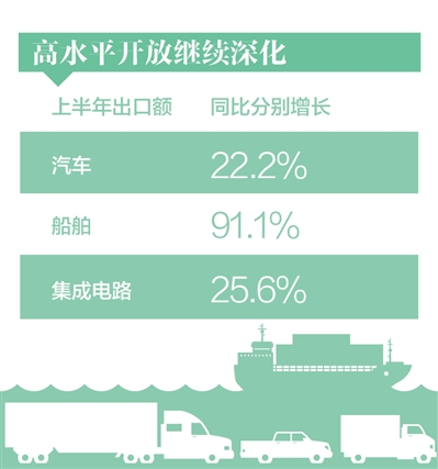 高水平开放继续深化。在世界经济增长动能偏弱、外部不确定不稳定因素增多的背景下,我国外贸出口质升量稳,进口规模稳步扩大,对经济增长作出了积极贡献。上半年,汽车、船舶、集成电路等产品出口额同比分别增长22.2%、91.1%、25.6%,货物和服务净出口对经济增长的贡献率为13.9%。我国积极拓展世界经贸合作“朋友圈”,上半年对共建“一带一路”国家合计进出口额同比增长7.2%。与此同时,免签国家范围继续扩大,外国人来华经商、旅游观光、探亲访友热度攀升,中外人员交流更加密切。上半年,全国各口岸入境外国人超1400万人次,其中通过免签入境的人次同比增长近2倍。