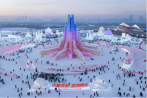 2025年1月5日,在哈尔滨冰雪大世界园区,游客在主塔“亚洲同心”附近游玩(无人机照片)。新华社记者谢剑飞摄
