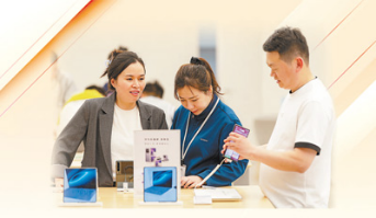 浙江金华一大型商业购物中心里,顾客在挑选新款手机。