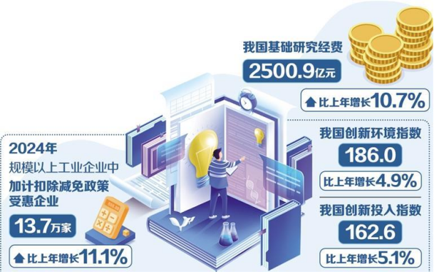 创新环境持续改善,人才支撑得到加强。2024年,我国创新环境指数为186.0,比上年增长4.9%,该领域5个评价指标指数全部实现增长。评价指标中,理工类毕业生占适龄人口比重指数比上年增长10.8%,连续3年保持两位数增长,高素质研发人才储备成为支撑我国科技创新的重要生力军。研发费用加计扣除政策红利持续释放,激励更多企业持续开展创新活动,2024年,规模以上工业企业中加计扣除减免政策受惠企业达13.7万家,比上年增长11.1%。