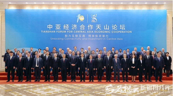 12月2日,中亚经济合作天山论坛在乌鲁木齐举行。这是开幕前,财政部部长蓝佛安,自治区党委书记、兵团党委第一书记、第一政委陈小江与出席论坛的中外嘉宾集体合影。天山网-新疆日报记者崔志坚摄