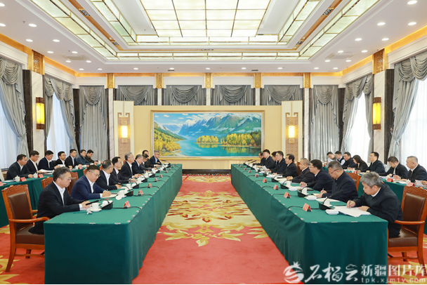 1月7日,自治区党委书记陈小江、自治区主席艾尔肯·吐尼亚孜在乌鲁木齐会见华润(集团)有限公司董事长王祥明、总经理王崔军一行。天山网-新疆日报记者崔志坚摄