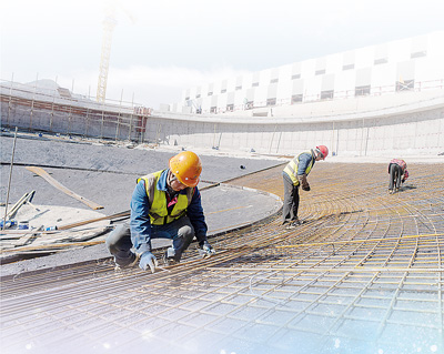 工人在贵州毕节市赫章县水塘堡乡猪拱塘铅锌矿建设现场扎钢筋。
