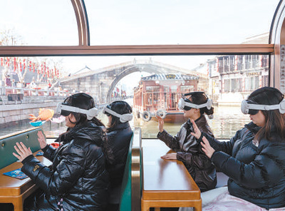 游客在江苏无锡市梁溪区清名桥历史文化街区沉浸式体验水上VR游船项目。
