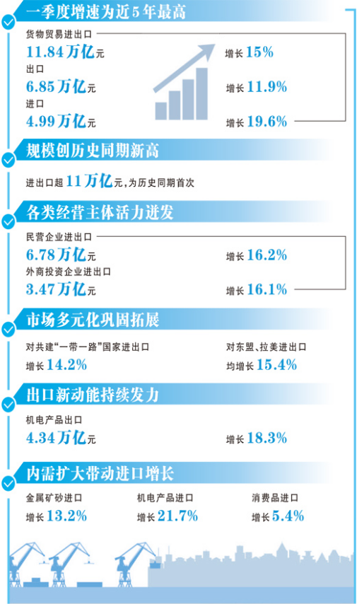 “今年以来,外部形势更加复杂多变,我国外贸起势有力、开局良好。”海关总署副署长王军表示,一季度进出口超过11万亿元,为历史同期首次,季度增速也是近5年最高。