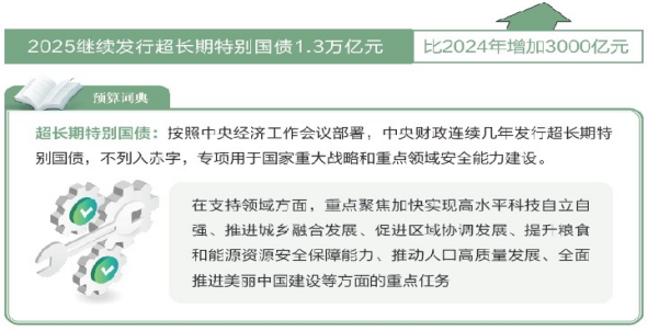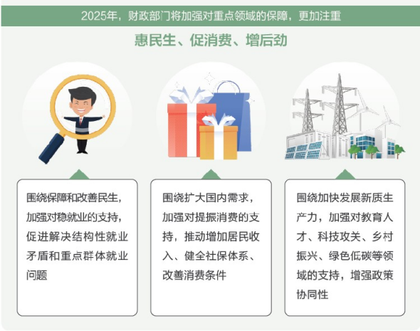 2024年,“两重”“两新”政策加快落地,有效释放投资和消费需求。这背后,离不开财政资金尤其是超长期特别国债的支持。2025年,围绕支持培育新质生产力,建设现代化产业体系,财政投入将持续加大。2025年,中央财政安排产业基础再造和制造业高质量发展专项资金118.8亿元、增长14.5%,推动制造业重点领域高质量发展。安排超长期特别国债2000亿元用于设备更新,增加500亿元,进一步扩范围、降门槛。当前,虽然财政收支压力不小,但民生投入力度不减,教育、社会保障和就业、卫生健康等重点民生领域支出继续保持较大增幅,“惠民生”导向鲜明。