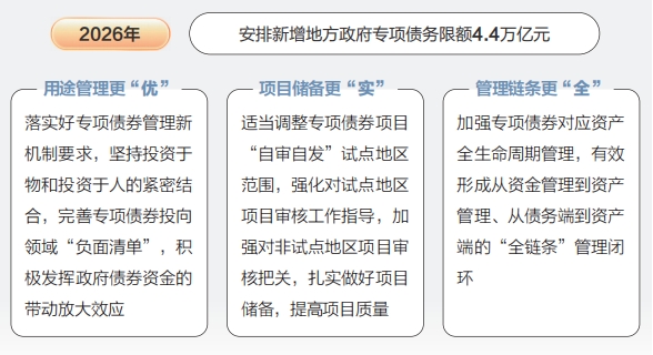 2026年,新增地方政府债务限额5.2万亿元,其中,新增地方政府专项债务限额4.4万亿元,支持建设重大项目、置换隐性债务、消化政府拖欠账款等。