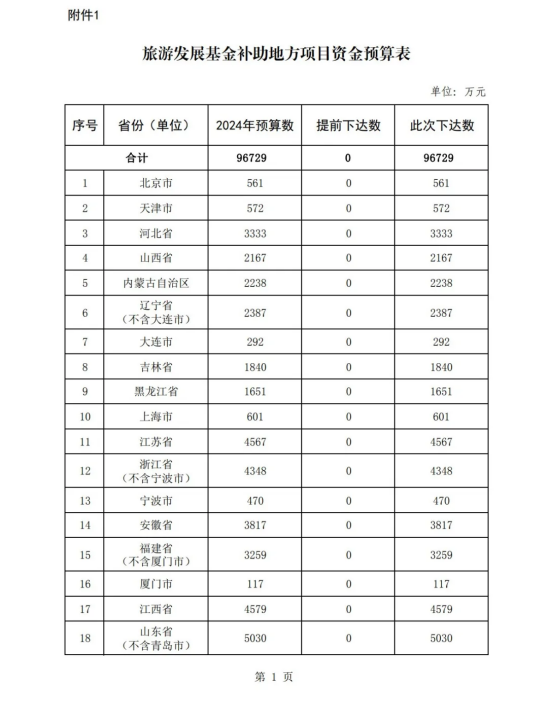 经研究,现下达2024年旅游发展基金补助地方项目资金(项目代码:10000022Z221108000004,2024年政府性基金预算支出功能分类科目:2070904“地方旅游开发项目补助”),具体金额详见附件。