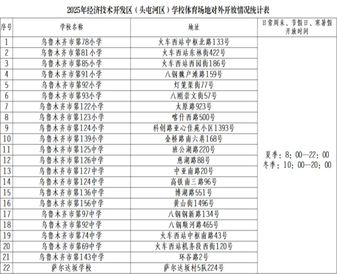 乌鲁木齐市公布的2025年十件民生实事中提出要丰富群众文体生活持续推动不少于200所中小学室外操场在节假日和寒暑假对群众免费开放本次经开区(头屯河区)经过全区摸排按照“应开尽开”的原则对符合条件的22所学校体育场全天免费向社会开放满足市民就近锻炼需求。