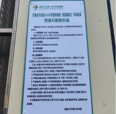 4月15日下午乌鲁木齐市第126中学张贴了校园室外场地开放的告知周末、节假日和寒暑假期间学校将按照夏季早8点到晚22点冬季早10点到晚20点的时段免费向市民开放学校室内外田径场。
