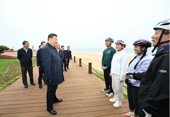 2024年5月22日至24日,中共中央总书记、国家主席、中央军委主席习近平在山东考察。这是22日下午,习近平在日照市阳光海岸绿道同市民亲切交流。新华社记者谢环驰摄