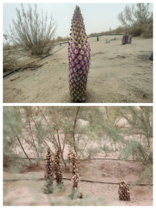 上图为肉苁蓉开花(受访者供图);下图为肉苁蓉开花变干后(摄于2025年6月13日),新华社记者刘诗平摄