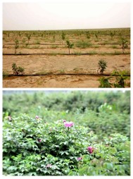 上图为七仙女防沙治沙标杆项目区套种的玫瑰和桃树,下图为七仙女村的玫瑰(摄于2025年6月16日)。新华社记者刘诗平摄