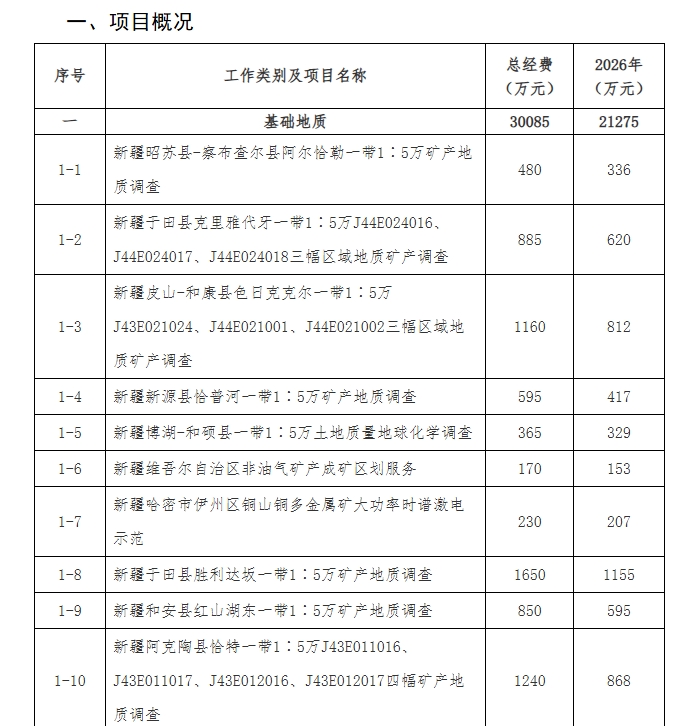 根据2026年新疆地质勘查工作安排,受自治区地质勘查管理中心委托,自治区公共资源交易中心采取公开招标方式选择自治区财政出资168个地质勘查项目的承担单位,公告如下: