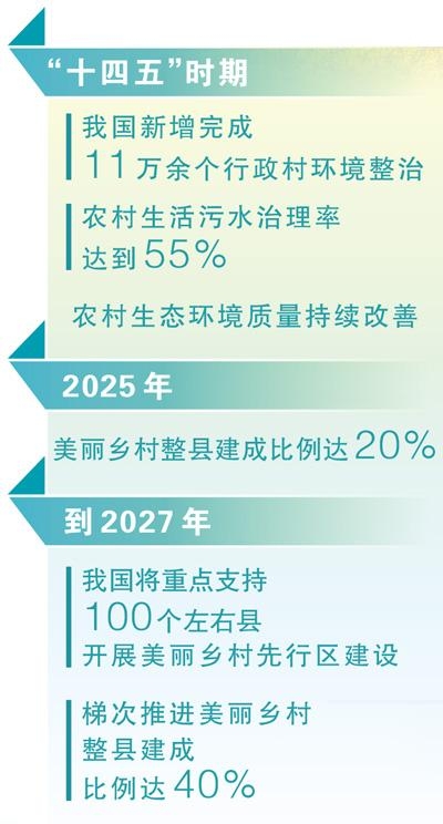 “建设美丽乡村是实现乡村全面振兴的基础支撑,良好生态环境是农村最大优势和宝贵财富。”赵世新介绍,到2027年,我国将重点支持100个左右县开展美丽乡村先行区建设,梯次推进美丽乡村整县建成比例达40%。