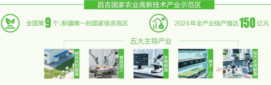 围绕棉花纺织服装、食品加工、生物制造、种子、现代农资制造五大主导产业,昌吉农高区集聚66家国家级、自治区级、自治州级等农业产业化龙头企业。2024年,昌吉农高区全产业链产值达150亿元。