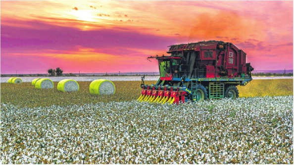 10月12日,大型采棉机在克拉玛依市农业综合开发区棉田来回穿梭,将采收的棉花打包成一个个形同巨蛋的棉包。该市持续优化种植布局,推动棉花等经济作物向优势区域聚集。今年,当地共种植棉花30万亩,目前已进入大采收尾期,预计总产量超13万吨。
