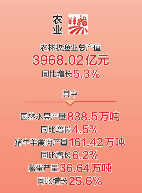 前三季度,全区第一产业增加值1959.71亿元,同比增长4.9%,高于全国1.1个百分点,贡献率达11.2%。全疆秋粮长势良好,全年粮食生产有望再获丰收。全疆园林水果产量838.5万吨,同比增长4.5%。其中,葡萄产量313.94万吨,同比增长3%;苹果产量92.28万吨,同比增长5%;杏产量89.03万吨,同比增长3.2%。