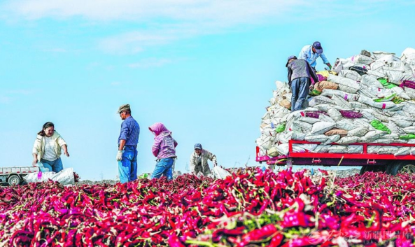 日,乌苏市八十四户乡组织乡村干部、党员志愿者深入田间地头帮助农民采摘、运输辣椒。近年来,该市立足资源优势,采取