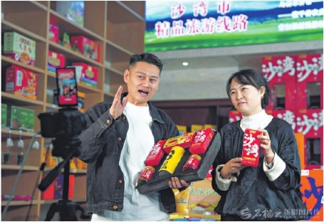 日,沙湾市文旅局党员干部和产业联盟电商人才一起直播销售农特产品。该市推行“党建