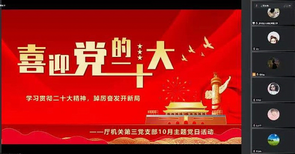 10月21日,厅机关第三党支部(行政政法处、法制税政处)以“学习贯彻党的二十大精神,踔厉奋发开新局”为主题开展线上主题党日活动,组织全体党员集体学习党的二十大精神。支部全体党员干部、入党积极分子、青年团员等参加活动。