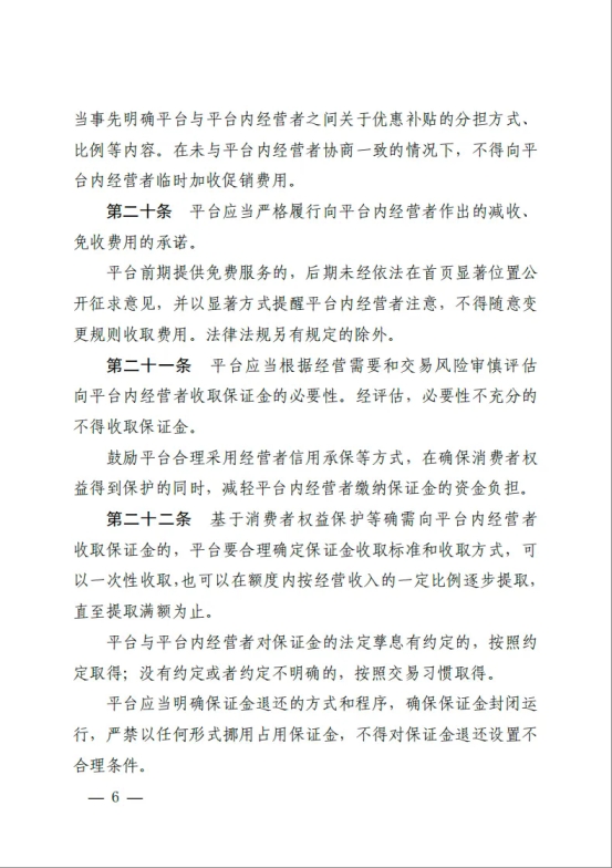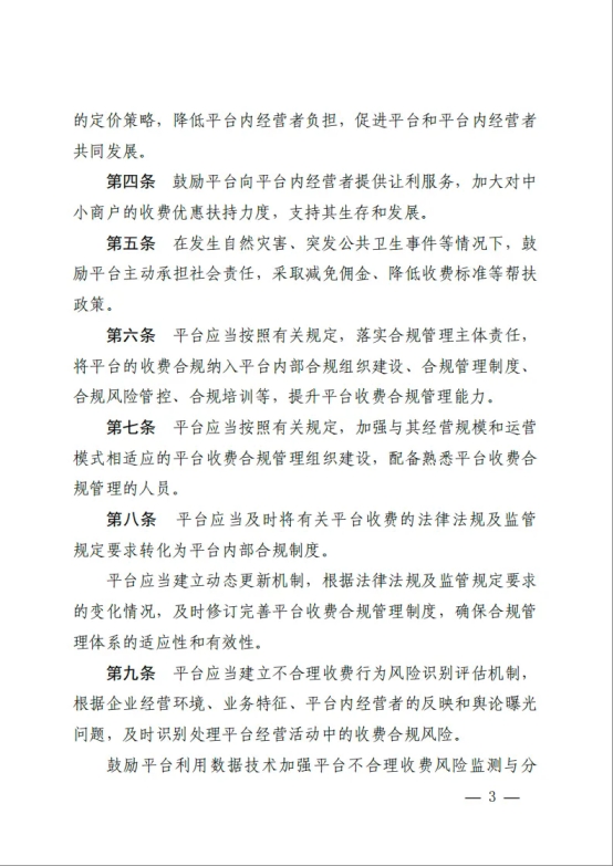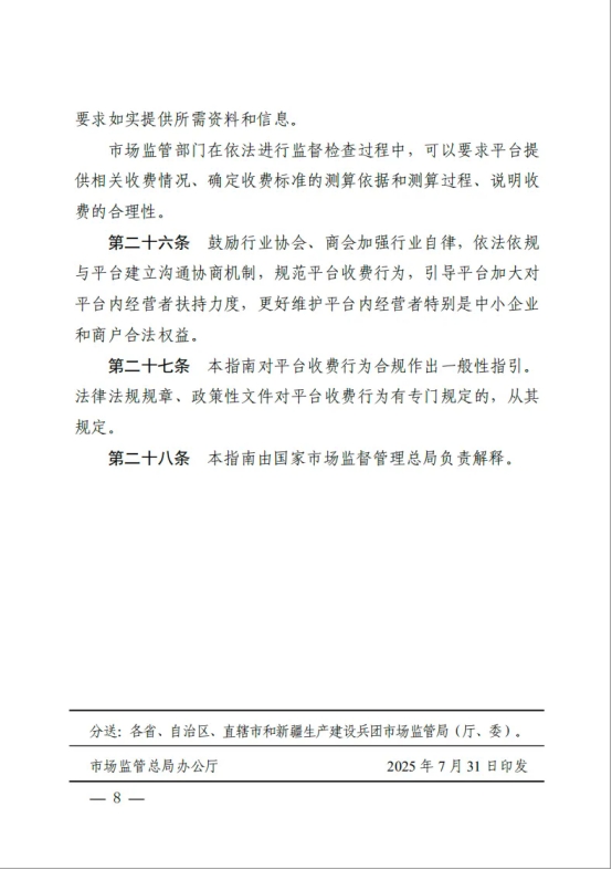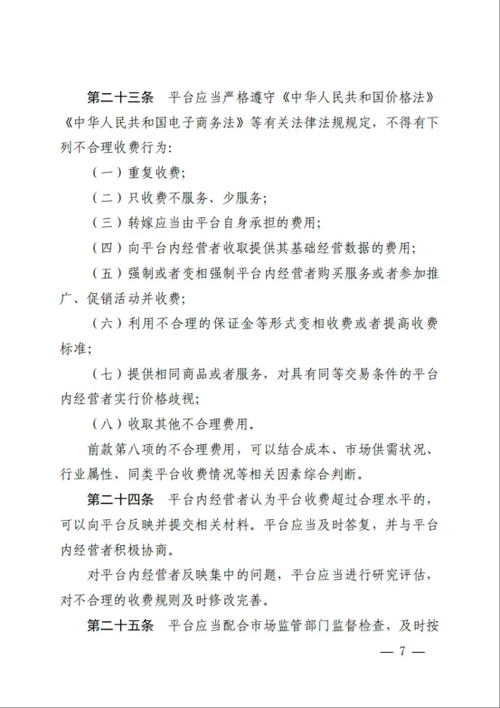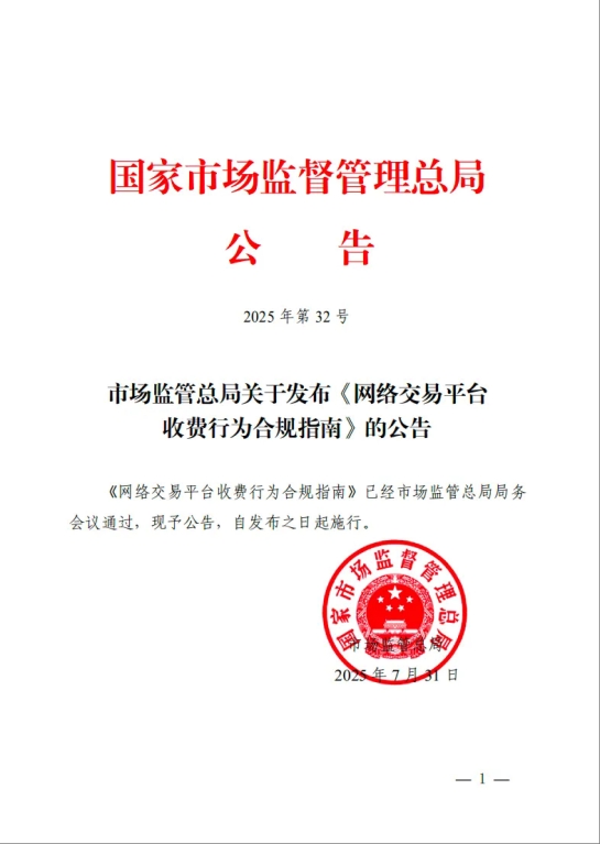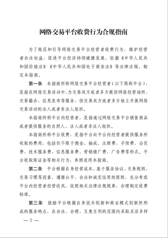 7月31日,市场监管总局发布并施行《网络交易平台收费行为合规指南》(以下简称《指南》),进一步规范网络交易平台向平台内经营者收取佣金、抽成、会员费、技术服务费、信息服务费、营销推广费等收费行为。