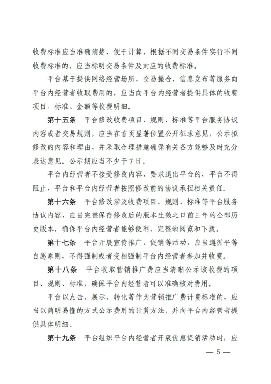 《指南》明确平台收费规则公示义务,要求平台在首页显著位置持续公示平台收费服务协议内容、交易规则信息等。明确平台修改收费规则需依法公开征求意见。明确收费规则历史版本保存时间,完整保存修改后的版本生效之日前三年的全部历史版本。