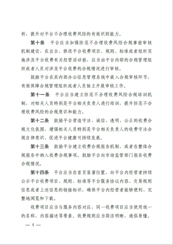 《指南》明确了平台收费应遵循的原则,倡导降低平台内经营者负担,强化平台合规自律,规范平台收费行为。《指南》要求平台落实合规管理主体责任,健全合规管理组织、配备合规管理人员,及时将监管制度内化为合规制度,建立不合理收费行为风险识别评估机制,加强防范不合理收费风险合规事前审核机制建设,强化合规培训,营造合规文化。
