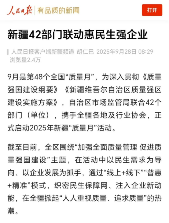 9月是第48个全国“质量月”,为深入贯彻《质量强国建设纲要》《新疆维吾尔自治区质量强区建设实施方案》,自治区市场监管局联合42个部门(单位),携手全疆各地及行业协会,正式启动2025年新疆“质量月”活动。