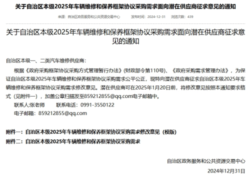 12月31日,《关于新疆自治区本级2025年车辆维修和保养框架协议采购需求面向潜在供应商征求意见的通知》发布,意见征集截止时间为2025年1月20日前。